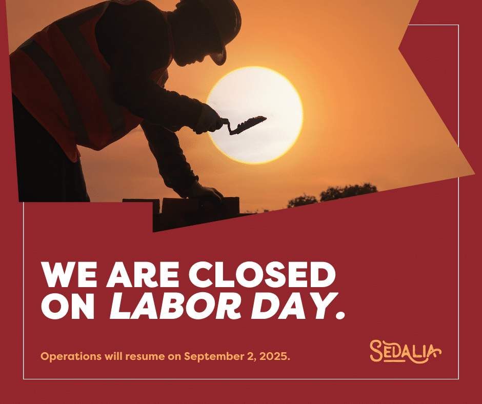 City of Sedalia offices will be closed on Monday, September 1, 2025 in observance of Labor Day. Regular business hours will resume on Tuesday, September 2, 2025.